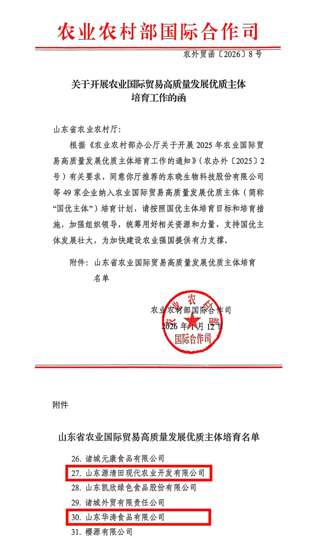 近期,2025年山东省农业国际贸易高质量发展优质主体培育名单公布,我市山东源清田现代农业开发有限公司、山东华涛食品有限公司两家企业入选。