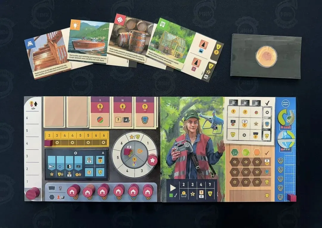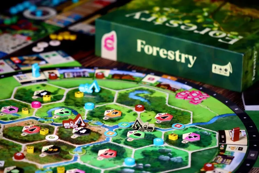 《林业》是一款1-4人的策略桌游,玩家扮演森林管理者,在10个固定回合内,通过高效规划行动来收获木材、加工处理、履行合同以获取胜利点数。