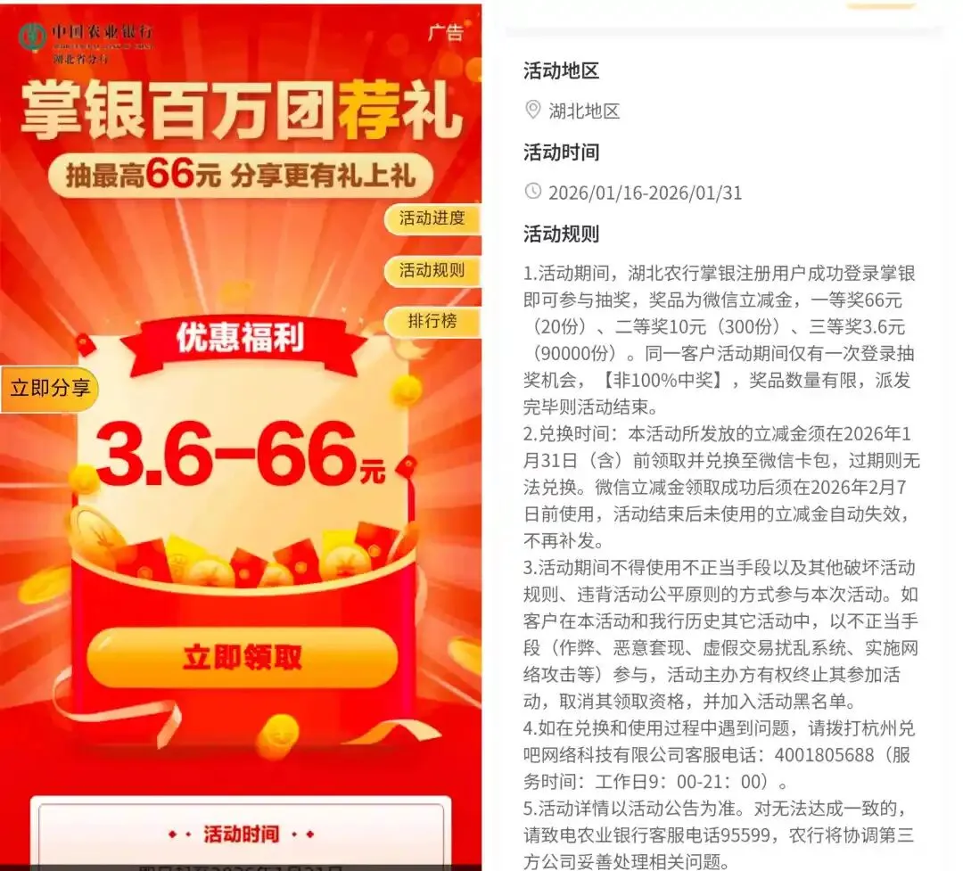 农业银行湖北分行用户的专享福利活动,参加活动进入可直接参加抽奖一次,奖品为3.6~66元的微信立减金一份,中奖率还是比较高,湖北农行的用户可以看看