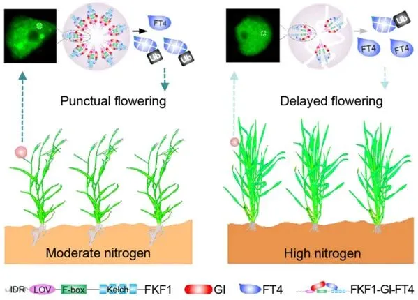 研究首先在二穗短柄草中鉴定到一个单子叶植物特有的抑制开花的反式成花素(anti-florigen)蛋白,当编码该蛋白的FT4基因突变后,可显著削弱植物在高氮条件(HN)下的开花延迟。机制研究发现,正常施氮(MN)条件下,FT4蛋白在E3泛素连接酶FKF1形成的凝聚体中发生降解,从而保证植物正常开花;在HN条件下,该凝聚体形成效率下降,导致FT4大量积累,开花延迟。进一步研究发现,单子叶植物FKF1体内形成液-液相分离(LLPS),同时在Scaffold蛋白GI的帮助下招募FT4进入该凝聚体复合物;而双子叶植物FKF1由于不具有N端的内源无序结构(IDR),所以不能发生LLPS。
