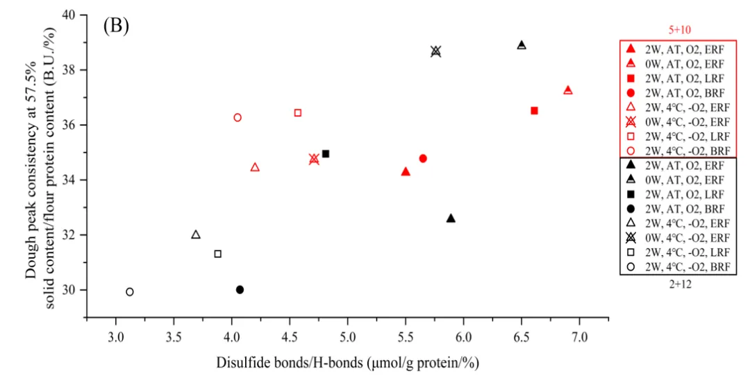面团黏稠度与延伸性等流变特性是影响面团可操作性和最终面制品质量的关键因素,这些特性与小麦蛋白质的结构与组成密切相关。本研究通过调控基因型、灌水条件、籽粒储存方式及选用不同籽粒部位,创制了具有不同蛋白质特性的样品体系。分析结果表明,面粉蛋白中氢键所占比例与面筋持水力呈显著正相关(P<0.01),说明氢键有助于促进面筋结构的舒展与稳定;而二硫键与氢键的比例则与单位数量蛋白质所贡献的面团峰值稠度显著正相关(P<0.01)。该研究从蛋白质分子间相互作用的角度,为解析面团流变特性的形成机制提供了新的视角,同时为小麦籽粒质量评价、面制品专用品种选育及相关专用面粉的研发奠定了理论依据。