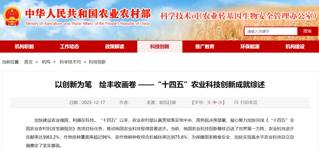 加快建设农业强国,利器在科技。“十四五”以来,农业农村部认真贯彻落实党中央、国务院决策部署,凝心聚力加快完成《“十四五”全国农业农村科技发展规划》各项目标任务,推动我国农业科技取得显著进步。当前,我国农业科技创新整体迈进了世界第一方阵,农业科技进步贡献率达到63.2%,作物良种覆盖率超过96%,农作物耕种收综合机械化率达到75.6%,为保障国家粮食安全、加快实现高水平农业科技自立自强奠定了坚实基础。