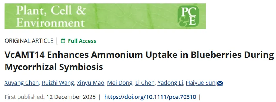 近日,吉林农业大学园艺学院李亚东教授团队孙海悦教授组在Plant, Cell & Environment在线发表题为“VcAMT14 enhances ammonium uptake in blueberries during mycorrhizal symbiosis”的研究论文。本研究发现VcAMT14基因在蓝莓ERMF共生体的氮响应调控中起着关键作用,为菌根介导的氮吸收机制提供了重要见解。