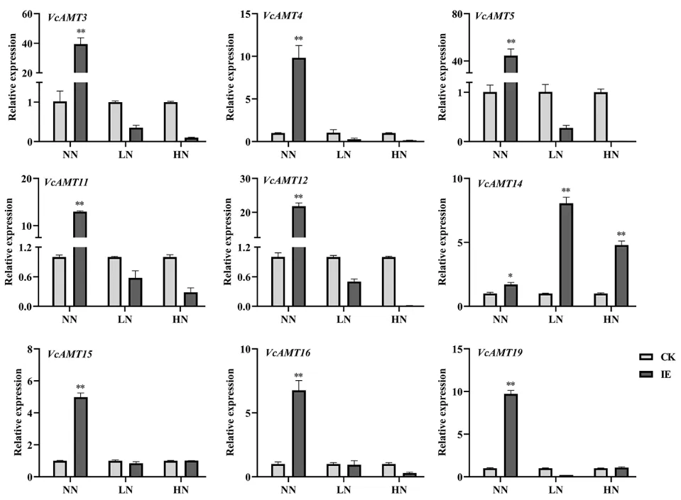 研究团队在蓝莓基因组中共鉴定出19个VcAMT基因家族成员。通过分析在不同组织中的表达情况,发现有9个VcAMT基因在根部高度表达。进一步研究表明,当植株接种ERMF(O. maius BL01)后,这9个VcAMT基因的表达水平均显著上调。值得关注的是,在对植株施加不同氮素水平处理后,只有VcAMT14在菌根共生条件下被显著诱导表达。这暗示着VcAMT14可能是菌根途径增强氮吸收过程中的关键基因。