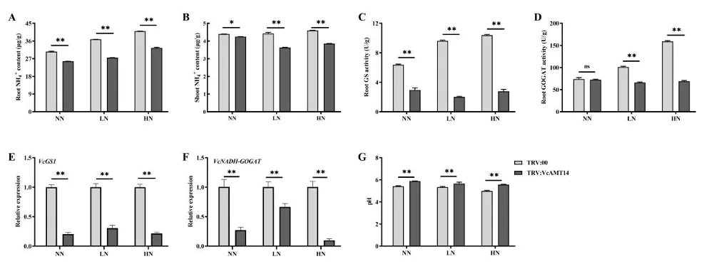 在此基础上,分析了不同氮素水平下接种O. maius BL01对蓝莓氮吸收与代谢的影响。结果发现,接种O. maius BL01后,不同氮素条件下蓝莓植株根围土壤脲酶活性、蔗糖酶活性、中性磷酸酶活性和碱性磷酸酶均有所提高,同时增加植株氮含量、根部GS/GOGAT活性以及根部VcGS1和VcNADH-GOGAT基因的表达水平,酸性磷酸酶在低氮条件下有所提升,而土壤pH整体降低。为了进一步研究VcAMT14基因的功能,对ERMF定殖后蓝莓根系中的VcAMT14基因进行瞬时沉默。与对照相比,在VcAMT14被沉默的蓝莓株系中,NH₄⁺含量显著下降,根部GS/GOGAT活性及VcGS1和VcNADH-GOGAT基因表达也明显降低,同时水培营养液的pH升高。这些结果表明,在菌根共生条件下,VcAMT14参与调控蓝莓植株的氮响应和吸收。