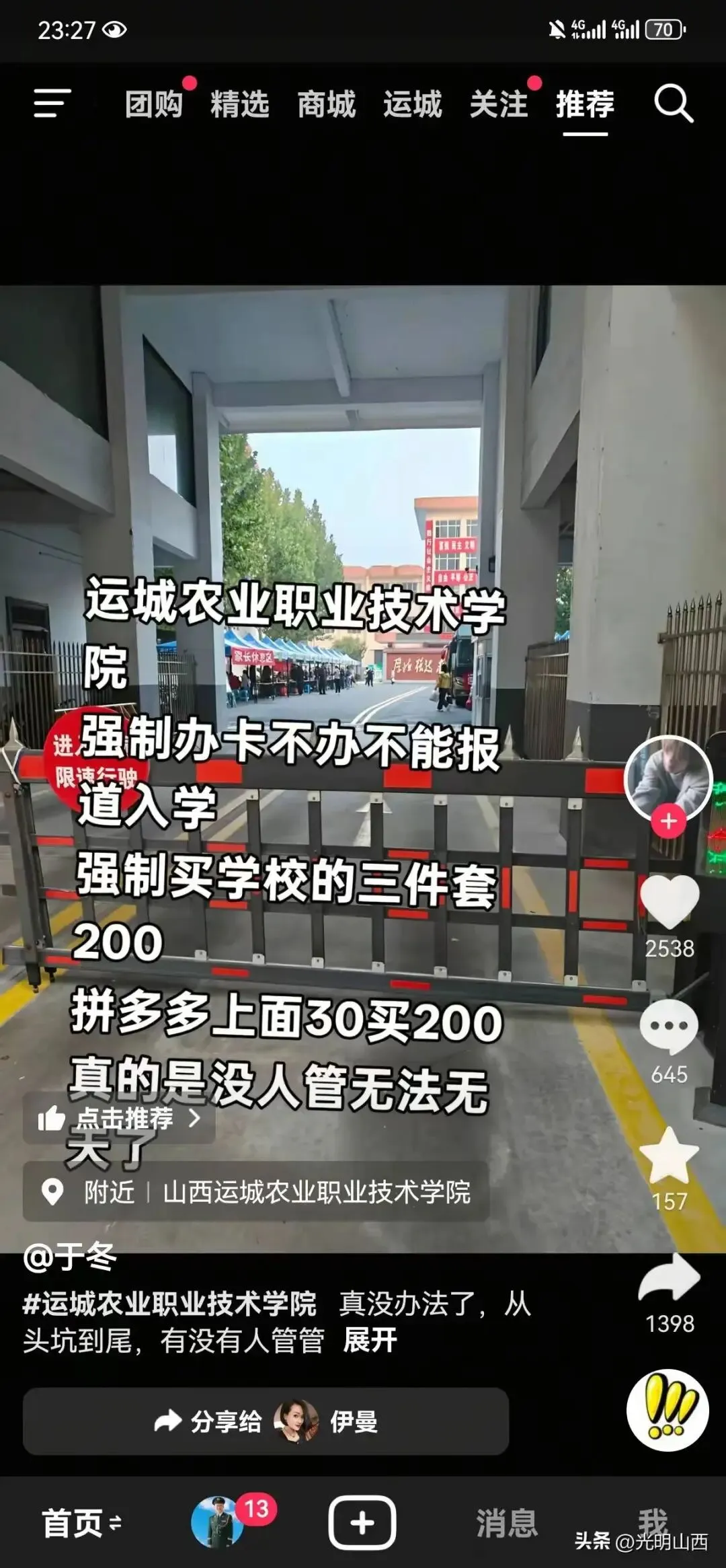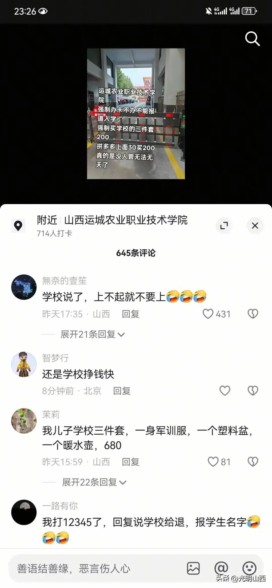 网爆运城农业职业技术学院强制办卡,学生不办卡不能入学