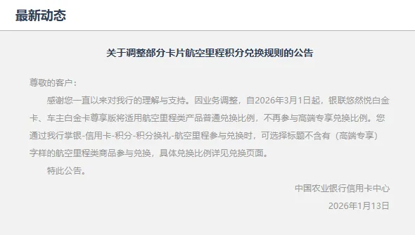 老农出了公告,把以前老屋推荐的小神卡的好权益给砍了一半。从2026年3月1日起,银联悠然悦白金卡、车主白金卡尊享版不再参与高端专享兑换比例。