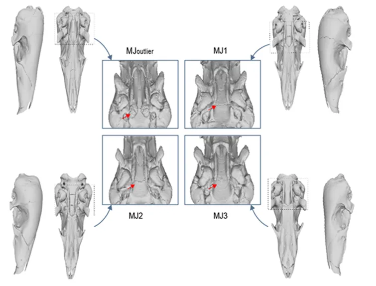 该研究对594只马来穿山甲开展了大规模群体基因组解析,结果揭示其存在3个遗传分化极为显著的种群(MJ1、MJ2、MJ3):其中MJ3种群规模最大,分布范围从中国大陆延伸至几乎整个东南亚地区;MJ1与MJ2种群规模相对较小,分布局限于婆罗洲岛屿及周边(图2)。马来穿山甲的遗传分化模式得到头骨形态学比较结果的支持。此外,结合多维度基因组证据、并首次利用头骨形态学证据(图3),揭示了第五种亚洲穿山甲——神秘穿山甲(M. mysteria)的存在;推测其分布区可能是婆罗洲东北部或其邻近地区。