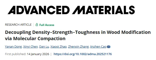 木材作为天然的分层复合材料,在可持续材料科学中具有重要地位。然而,木材改性领域长期存在一个根本性的矛盾:如何在提升强度和韧性的同时不增加材料重量。数十年来,化学浸渍、聚合物渗透和热改性等传统方法都遵循着可预测的结构-性能关系,即强度提升往往以密度增加和韧性下降为代价。例如,酚醛树脂改性木材密度增加15%,强度仅提升3%,韧性却降低43%;糠醇改性木材强度提升25%,但增重率达70%,冲击韧性下降57%。近年来,虽出现纳米纤维素基复合材料等新方法,但这些工艺通常需要深度脱木质素和重构,从根本上改变了木材的天然结构。碳量子点作为一类超小碳纳米颗粒,在水相中表现出优异的分散性和丰富的表面官能团,但在木质纤维素基体中的应用受限于分散性差和界面结合弱的问题。本研究提出“分子压缩”策略,旨在通过纳米尺度调控打破传统木材改性的性能悖论。