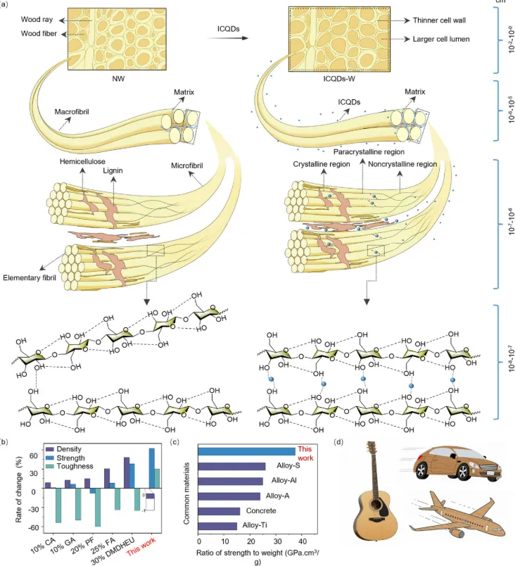 该研究建立的分子压缩策略代表了木材增强从传统加性范式向结构优化范式的转变,通过纳米尺度调控同时打破了强度-密度和强度-韧性的传统权衡关系。0.25%的ICQDs浓度即可实现轻质、高强、高韧的综合性能提升,使比强度和比模量分别提高37%和60%,性能媲美合金钢等工程材料。该方法工艺简单、添加剂用量极低,与标准浸渍工艺兼容,具备规模化生产潜力。改性木材在乐器、汽车零部件、航空航天等领域具有应用前景,10%的减重可带来7%的节能效果。研究证实ICQDs通过氢键网络实现高效应力传递,通过动态可逆的牺牲键机制耗散能量,从而抑制裂纹扩展。同时,该策略赋予木材抗菌和抗紫外线功能,提升了耐久性。尽管存在成本效益、规模化可行性和长期性能等局限,且不同木材物种可能需要参数优化,但分子压缩机制在骨组织工程、植物基复合材料等生物基材料设计中具有普适性潜力。这项研究为下一代可持续轻质结构材料的开发提供了新思路。