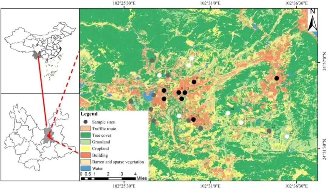 样地设置: 在昆明市选取了24个样点,涵盖不同城市化梯度(市中心到边缘),每个样点设置1000米长样线。