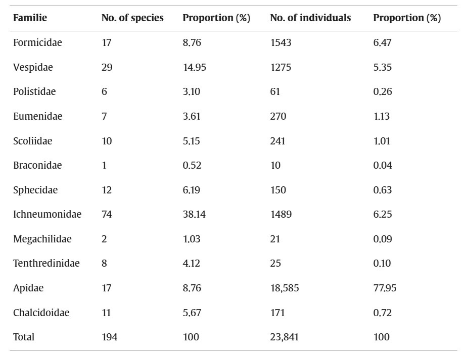 数据收集: 2022年7月至2024年6月,共采集膜翅目传粉昆虫 23841 头,隶属于 12 科 194 种。其中蜜蜂科占绝对优势 (77.95%),姬蜂科物种数最多 (74种) 。