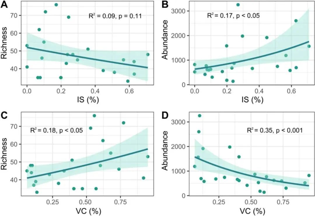 丰度: 与IS呈正相关,与VC呈负相关。这是因为高IS区域(城市化高)常种植大量开花植物,吸引了大量特定种类的传粉者(如蜜蜂)。