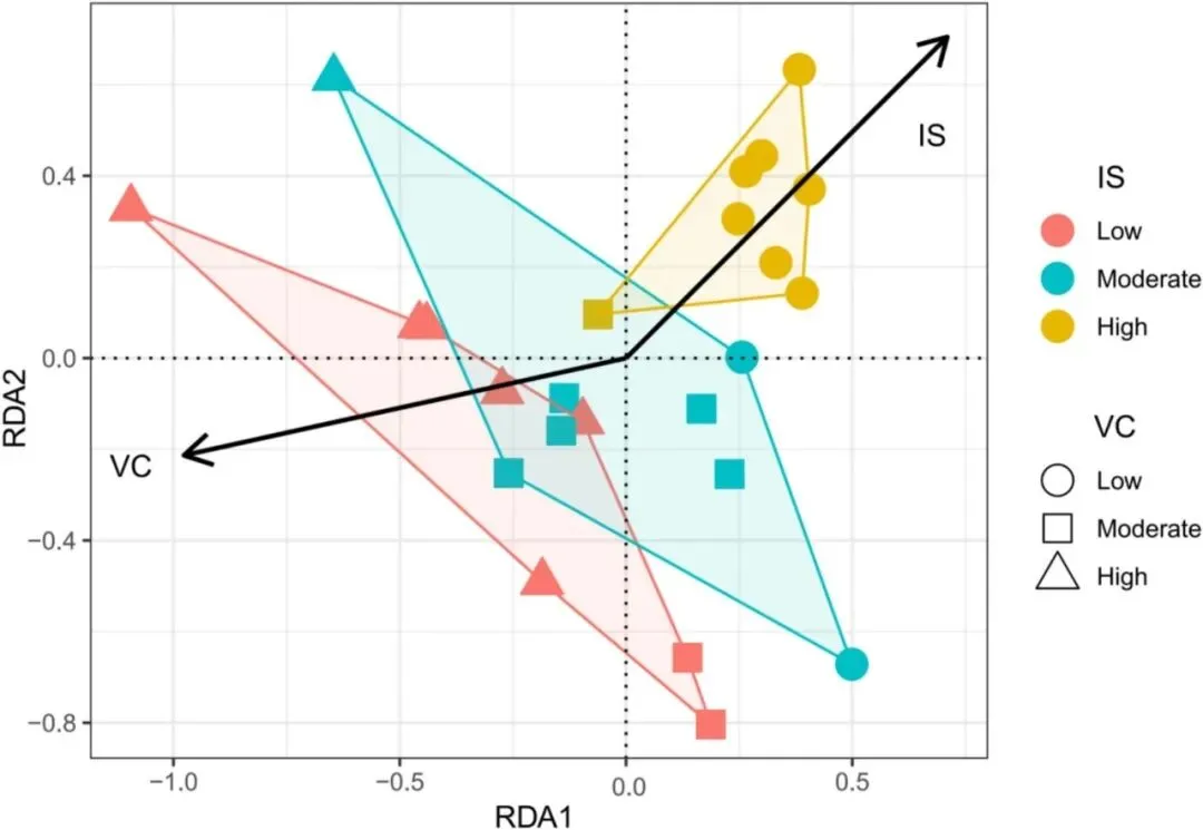 图7. 不同不透水面 (IS) 和植被覆盖度 (VC) 梯度下膜翅目传粉昆虫群落的冗余分析 (RDA)。
