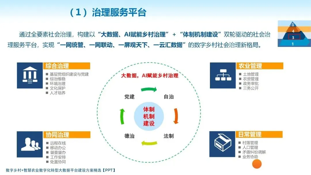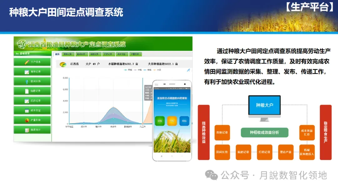 从乡村治理维度看,平台为精细化治理提供数据支撑。我国“大国小农”的国情农情决定了农业农村管理面临主体分散、地块细碎、事务繁杂等难题,而大数据平台可实现对农业农村“地、人、物、财、事”的全要素数字化管理。通过数据整合与分析,既能为土地流转、农田保护、惠农政策落实等提供精准依据,又能实现防返贫致贫动态监测与精准帮扶,推动乡村治理从“经验决策”向“数据决策”转变。