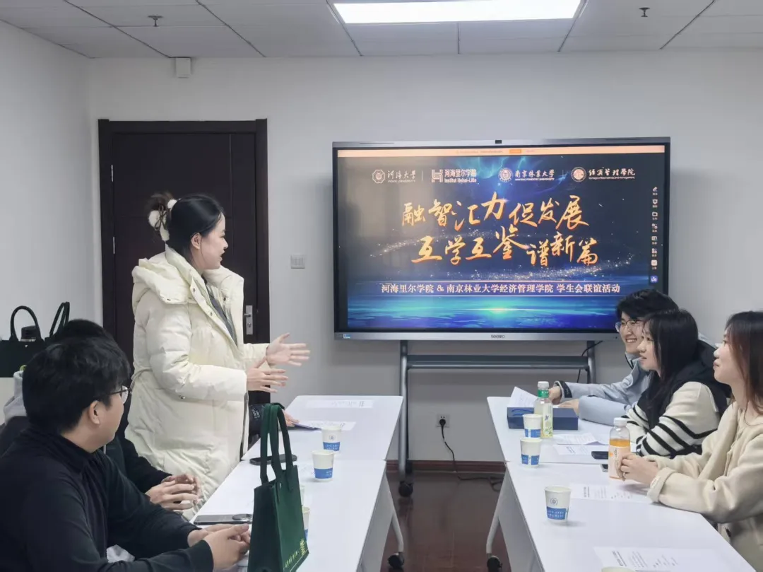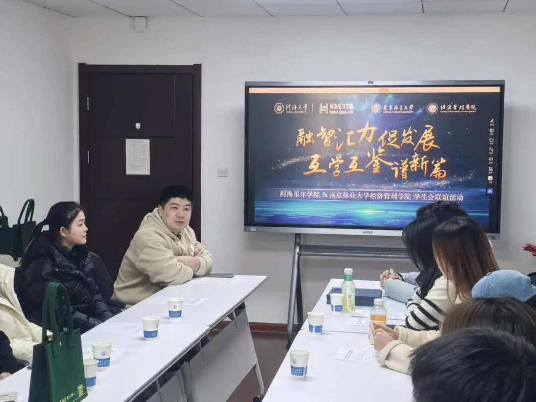 为加强高校学生会之间的沟通协作,分享工作经验,拓宽服务思路,1月13日下午,南京林业大学经济管理学院学生会与我院学生会开展联学交流,河海里尔学院团委书记周青老师与两院学生会骨干成员共同参与此次活动。