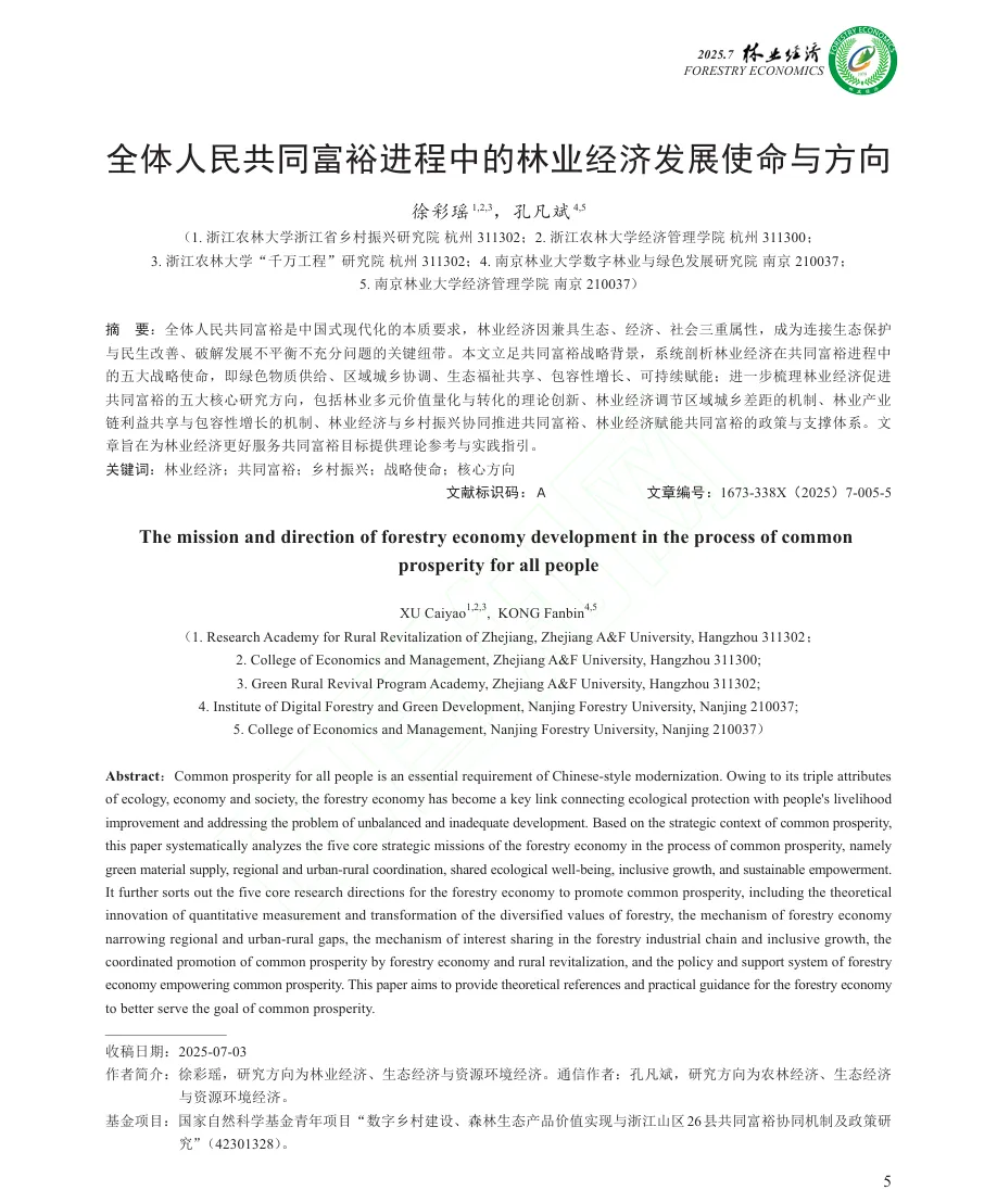近日,由徐彩瑶副教授作为第一作者,孔凡斌教授作为通信作者撰写的论文《全体人民共同富裕进程中的林业经济发展使命与方向》在《林业经济》期刊发表,现已在中国知网网络首发。该论文是孔凡斌教授主持承担的国家自然科学基金面上项目(42371294)以及徐彩瑶副教授主持承担的国家自然科学基金青年项目(42301328)和浙江省哲学社会科学规划研究课题(26NDJC107YB)的阶段性研究成果。