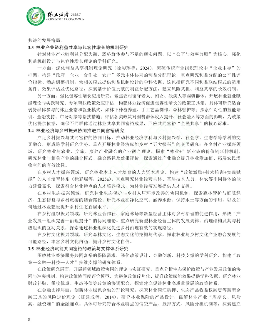 文章认为,全体人民共同富裕是中国式现代化的本质要求,林业经济因兼具生态、经济、社会三重属性,成为连接生态保护 与民生改善、破解发展不平衡不充分问题的关键纽带。本文立足共同富裕战略背景,系统剖析林业经济在共同富裕进程中 的五大战略使命,即绿色物质供给、区域城乡协调、生态福祉共享、包容性增长、可持续赋能;进一步梳理林业经济促进 共同富裕的五大核心研究方向,包括林业多元价值量化与转化的理论创新、林业经济调节区域城乡差距的机制、林业产业 链利益共享与包容性增长的机制、林业经济与乡村振兴协同推进共同富裕、林业经济赋能共同富裕的政策与支撑体系。文 章旨在为林业经济更好服务共同富裕目标提供理论参考与实践指引。