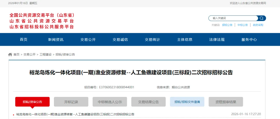施工招标|裕龙岛炼化一体化项目(一期)渔业资源修复--人工鱼礁建设项目(三标段)二次招标招标公告