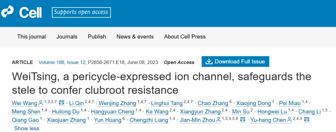2023年6月8日,中国科学院遗传与发育生物学研究所陈宇航团队与周俭民团队合作,在Cell上发表了题为WeiTsing, a pericycle-expressed ion channel, safe-guards the stele and confers broad-spectrum resistance to clubroot 的研究论文。该研究综合运用遗传学、生物化学、结构生物学、电生理学等手段,成功克隆了广谱高抗根肿病基因WeiTsing (WTS, 卫青),解析了WTS五聚体的三维结构并揭示了其阳离子通道功能,阐明了WTS介导钙信号激活植物免疫应答的分子机制。