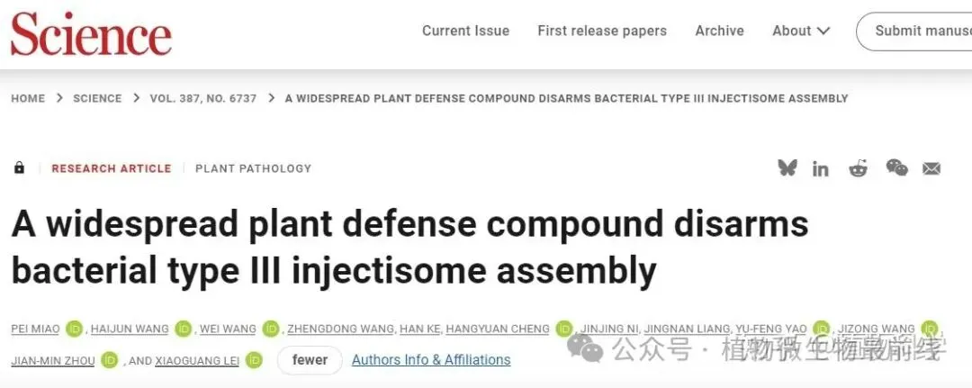 2025年2月28日,中国科学院遗传发育生物学研究所周俭民团队联合北京大学雷晓光团队在Science发表了题为“A widespread plant defense compound disarms bacterial type III injectisome assembly”的研究论文,该研究发现了一个新型植物抗病化合物并揭示了其不同寻常的作用机制。
