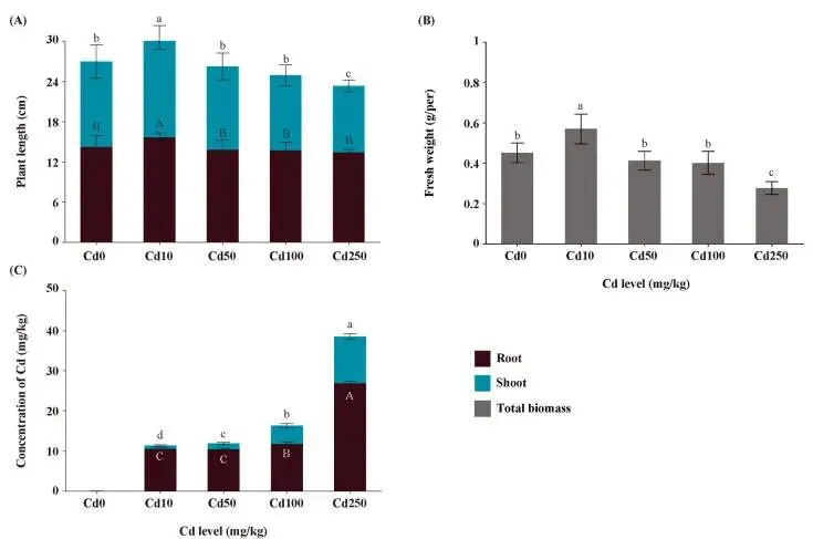 生长响应: 低浓度Cd(10 μmol/kg)促进生长,高浓度(50, 100, 250 μmol/kg)则显著抑制。
