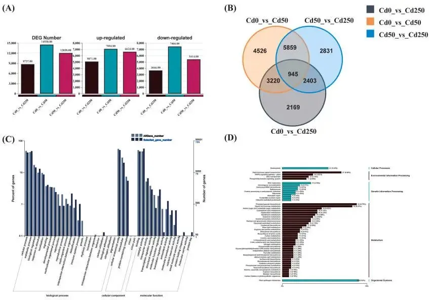 图2. 不同Cd处理下差异表达基因(DEGs)的分析。 (A) 展示Cd0_vs_Cd50、Cd50_vs_Cd250和Cd0_vs_Cd250三个比较组中上调和下调DEG数量的柱状图。(B) 三个比较组中DEG的韦恩图。(C) Cd胁迫响应性DEGs的GO功能分类。基因分布于生物学过程、分子功能和细胞组分三大GO类别中。(D) 来自Cd0_vs_Cd50_vs_Cd250比较组的DEGs的KEGG通路富集分析。图中显示了富集到每个通路的基因数量和富集率(百分比)。