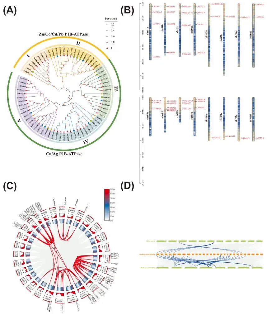 图3. 红豆草中OvHMA基因家族的系统发育关系、染色体分布和共线性分析。 (A) 来自红豆草、M. truncatula和O. sativa的HMA蛋白的系统发育树。(B) OvHMA基因的染色体分布。45个转录本(源自40个基因位点)被映射到其染色体位置。(C) 红豆草中OvHMA基因位点的基因组内共线性分析。(D) 红豆草、M. truncatula和O. sativa之间OvHMA基因位点的基因组间共线性。