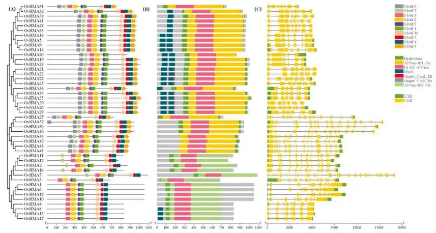 图4. OvHMA家族的保守基序和基因结构分析。 (A) 通过MEME预测的OvHMA蛋白中的保守基序,以不同颜色的方框表示。(B) 保守基序在OvHMA转录本中的分布。(C) OvHMA转录本的外显子-内含子结构。线条表示内含子,黄色矩形表示编码序列,绿色矩形表示非翻译区。