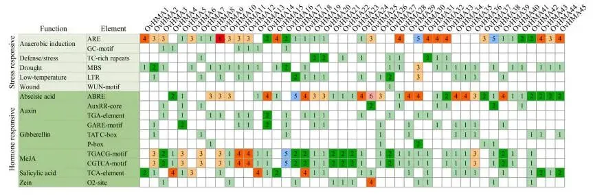 图5. OvHMA基因启动子区域的顺式作用元件。 分析的启动子序列选自起始密码子上游的2000 bp区域。不同颜色的方框代表不同类型的顺式作用元件,相应方框内的数字表示每种元件类型的数量。