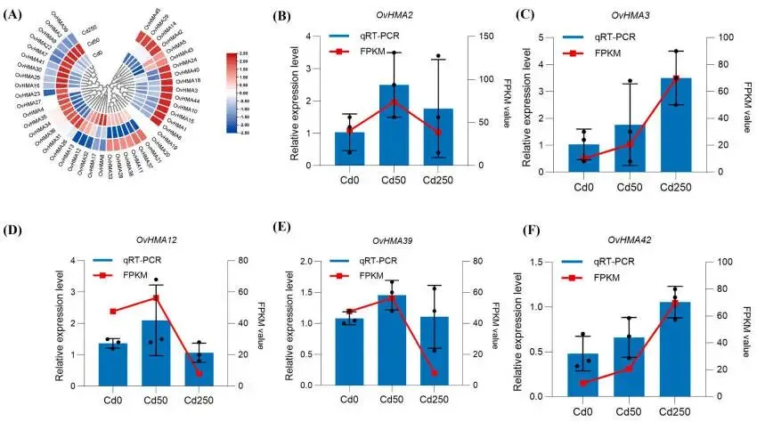 基于45个OvHMA转录本,进一步分析了它们在Cd胁迫下的表达模式。与对照组(Cd0)相比,OvHMA2、OvHMA4等转录本在50 μmol/kg Cd(Cd50)处理下上调,而OvHMA3、OvHMA6等在250 μmol/kg Cd(Cd250)处理下表达增加。相反,OvHMA8、OvHMA17和OvHMA32在Cd暴露后下调。值得注意的是,OvHMA3、OvHMA14、OvHMA18、OvHMA39、OvHMA42、OvHMA44和OvHMA45的表达水平随Cd浓度的升高而逐渐增加,表现出清晰的剂量依赖性响应。这些结果表明OvHMA转录本在Cd胁迫下表现出独特的调控模式。其中,OvHMA3转录本的表达强度随胁迫水平的增加而持续增强,表明该异构体可能在红豆草根系的Cd耐受性中扮演核心角色。为验证转录组数据的可靠性,随机选取了五个OvHMA转录本基因(OvHMA2、OvHMA3、OvHMA12、OvHMA39和OvHMA42)进行qRT-PCR分析,结果证实其表达趋势与RNA-seq数据一致 (Fig. 6 A, B–F)。
