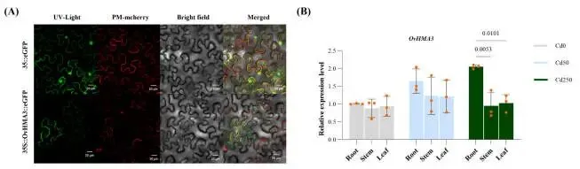 图7. OvHMA3在烟草叶片表皮细胞中的亚细胞定位和表达模式。 (A) OvHMA3的亚细胞定位。标尺:20 μm。pCAMBIA1300–35S-VAC-mCherry被用作液泡膜标记。(B) 在Cd0、Cd50和Cd250处理下,OvHMA3在根、茎和叶中的表达模式。