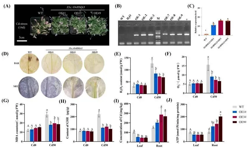 图9. 野生型和过表达OvHMA3的拟南芥对Cd胁迫的表型和生理指标。 (A) CdCl₂处理下的表型。标尺:5 cm。(B) 六个转基因系中OvHMA3转基因插入的PCR验证。使用靶向转基因插入位点的特异性引物进行PCR扩增,产物通过琼脂糖凝胶电泳分析。H₂O(无模板)和WT(野生型)作为阴性对照,pBI121-OvHMA3质粒(+)作为阳性对照(含有目标片段)。(C) 转基因系OE1、OE3和OE9中OvHMA3的相对表达水平。(D) DAB和NBT染色。(E) 拟南芥叶片中的H₂O₂含量。(F) 拟南芥叶片中的O₂·⁻含量。(G) 拟南芥叶片中的MDA含量。(H) 拟南芥叶片中的GSH含量。(I) 50 μmol/kg Cd处理下WT和转基因植物叶片和根中的Cd含量。(J) 50 μmol/kg Cd处理下WT和转基因植物叶片和根中的ATP含量。不同字母表示Cd胁迫与对照之间存在显著差异(P < 0.05)。误差棒代表±SE(n = 4)。