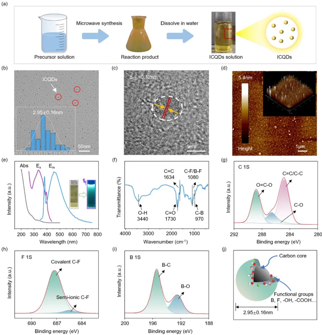 图2.ICQD的合成与表征。(a) 单电位微波合成工艺的示意概述,该过程将前驱体溶液转化为稳定的水性ICQDs溶液。(b–d)形态学特征证实了单分散、准球形纳米颗粒的形成。透射电子显微镜(TEM)显示粒子平均直径为2.95±0.16纳米(b),高分辨率透射电子显微镜(HRTEM)显示出明显的晶格条纹,d间距为0.12纳米,对应石墨碳(c)的(020)平面。原子力显微镜(AFM)证实其纳米尺度尺寸,高度低于5.4纳米(d)。(e) ICQDs的光学性质,显示出在365纳米紫外线照射下具有特征性的紫外-可见吸收峰和明亮的蓝色光致发光(PL)(插入)。(F–i)光谱分析阐明表面化学。傅里叶变换红外(FTIR)光谱(f)确认存在丰富的含氧官能团,以及含F和B基团。高分辨率X射线光电子谱(XPS)对C1s(g)、F1s(h)和B1s(i)的光谱进一步详细描述了纳米粒子表面的共价键和半离子键。(j) 单个ICQD的示意模型,概述其石墨核心和多功能表面化学。比例杆:b,50;c,1;d,1微米。