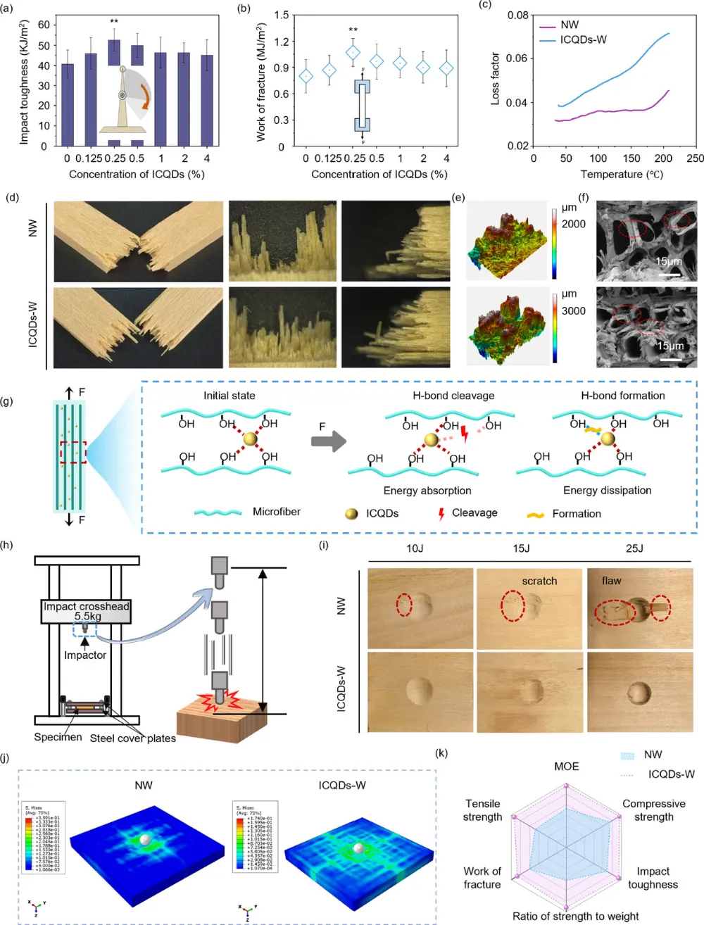 图5.增强韧性和缓冲性能。(a,b)宏观韧性测量显示冲击韧性(a)增加了约30%,拉伸试验(b)在最佳0.25% ICQDs浓度下断裂功达到峰值。(c)动态机械分析(DMA)的损耗因子,表明ICQDs-W在宽温范围内相较于NW具有更优越的能量耗散能力。(D–F)多尺度断裂形态分析。在宏观尺度上,ICQDs-W的骨折路径更为曲折,如数码相机图像(d)和三维剖面测量(e)所示。在微观尺度上,扫描电子显微镜图像(f)显示出广泛的纤维拉拔和塑性变形,这些都是有效能量吸收的标志。(g)示意图,展示了所提的增难机制,其中ICQDs与纤维素之间的动态氢键网络作为“牺牲键”,以分散能量并抑制裂纹传播。(h,i)落重冲击测试。示意图(h)显示了实验装置。撞击后图像(i)展示了ICQDs-W在更大冲击能量下极佳的损伤控制能力,能抵抗灾难性失效,这与NW形成对比。(j)有限元分析(FEA)模拟显示ICQDs-W在10焦耳撞击时更均匀的应力分布。(k)雷达图,总结了ICQDs-W在西北方向的全面机械性能增强。比例条:f,15微米。误差条表示n=8或10次重复的标准差(s.d.)。统计显著性相对于对照组由Dunnett检验确定。星号表示显著性水平如下:p 第<0.05,p 第< 0.01,第<0.001页。******