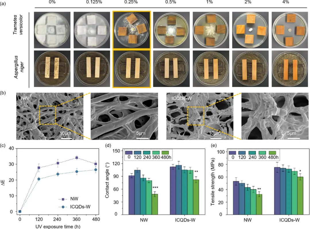 图6.ICQD处理木材的耐久性。(a) 4周后对白腐真菌(Trametes versicolor)和黑曲霉菌(Aspergillus niger)进行抗真菌效果。ICQDs在≥0.25%浓度下有效抑制真菌定植。(b)显微镜显微镜,揭示微观抗真菌机制。与天然木材(NW)上丰富且强健的菌丝不同,ICQDs-W上的真菌菌丝稀少且呈干瘪,证实了对真菌生长的有效抑制作用。(c–e)经过480小时加速耐候测试后的性能。ICQDs-W表现出更优越的色彩稳定性,总色差(ΔE)(c)更低,表面疏水性(接触角d)保持更好,抗拉强度保持(e)显著高于NW。比例条:b,10微米(左面板),5微米(右面板)。误差条代表n=8次重复的标准差(s.d.)。统计显著性相对于对照组由Dunnett检验确定。星号表示显著水平如下:p <0.05,p <0.01,p <0.001。 ******