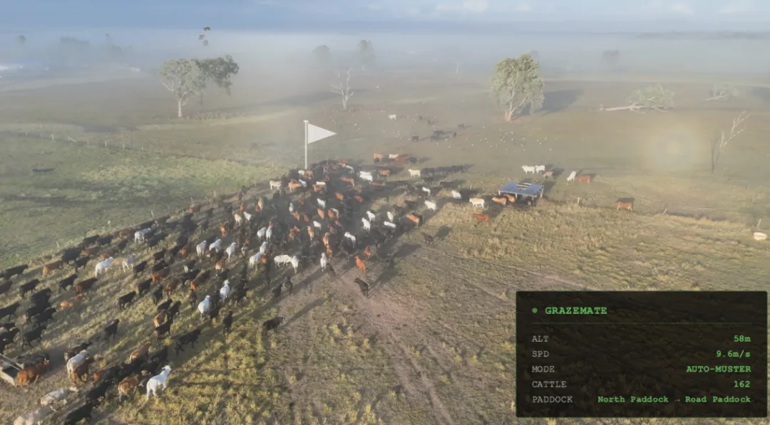 目前,GrazeMate已在昆士兰和新南威尔士的两个试点牧场每周放牧数千头牛,覆盖面积达170万英亩。第一代产品专注于放牧功能,通过移动应用控制,可在轮牧系统中将牛从一个区域转移到另一个区域,或根据季节需要在牧场和围栏之间移动。无人机还能拍摄水槽和围栏线照片,让牧场主一目了然地判断是否需要采取行动。