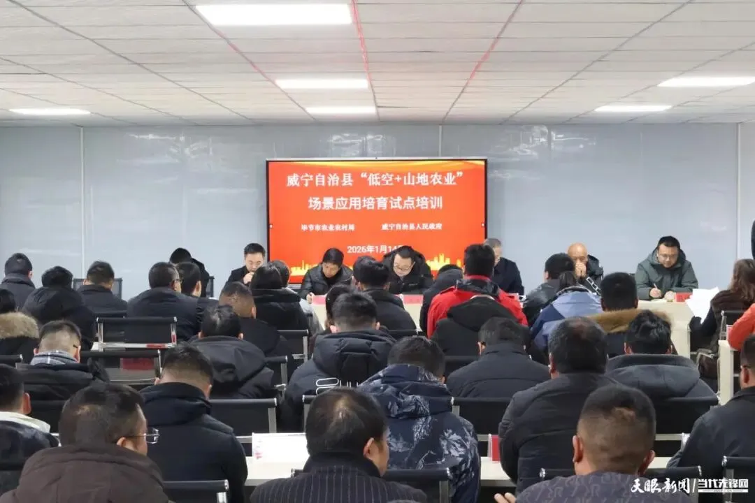 1月14日,毕节市“低空+山地农业”场景培育试点培训会在威宁自治县隆重举行,标志着贵州省首个“低空+农业”试点项目正式落地启航。来自省、市、县三级农业、发改、科技等部门,以及各农业企业、专业合作社的百余名代表齐聚一堂,沉浸式体验无人机技术在山地农业中的创新应用,共探农业新质生产力助力乡村振兴的实践路径。