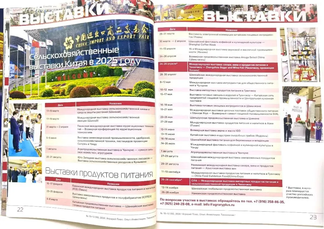 ·展会之窗:系统罗列了2025年在中国举办的众多农业、食品相关重要展会信息,为俄方企业提供了全面的市场参与指南。