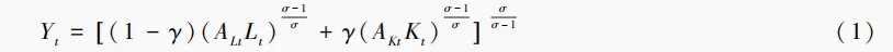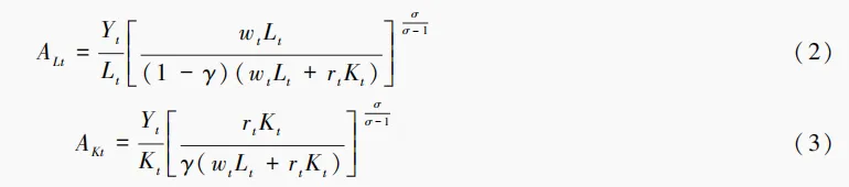 设定农业部门CES生产函数如式(1),Yt为农业产出,Lt、Kt为农业劳动投入、农业资本投入,γ为要素分配参数,σ为要素间替代弹性,AL、AK为劳动技术效率与资本技术效率,是技术进步对要素偏向作用的直接体现。ALL、AKK为以要素技术效率衡量的反映投入产出效率的要素禀赋,简称为劳动综合禀赋和资本综合禀赋。ALL、AKK既体现了显性的资本要素和劳动要素投入,又包含了隐形的有偏技术进步对投入要素的增强,可以全面反映资本要素和劳动要素的综合产出效率,同时较好地平衡资本和劳动投入量纲的不同可能带来的偏误问题。