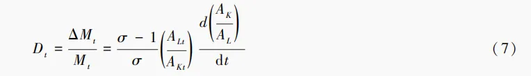 构造农业技术进步偏向指数Dt,见式(7)。这一指数与陆雪琴和章上峰[23]依据希克斯“技术非中性”定义构建的有偏技术进步指数是一致的,用以判断技术进步的要素偏向性。