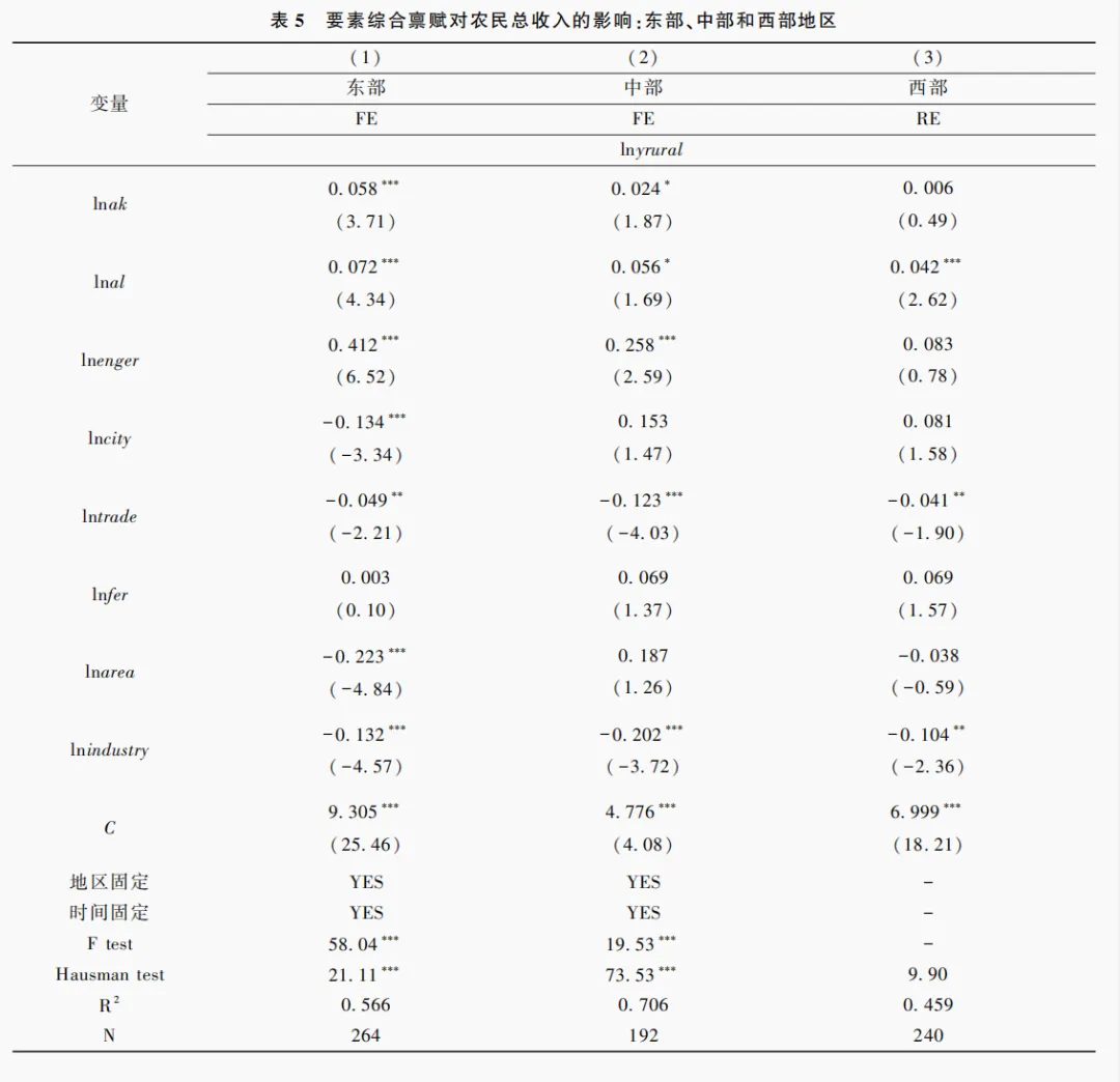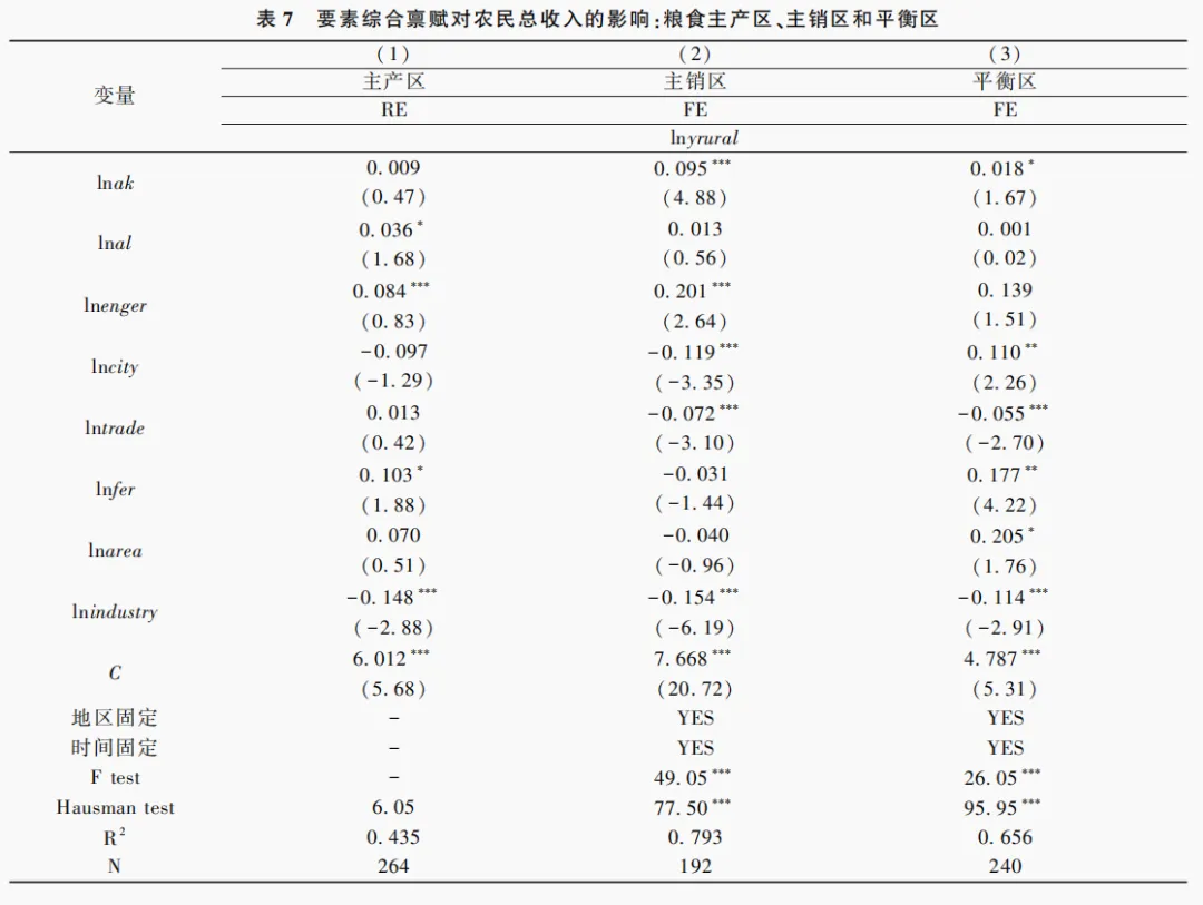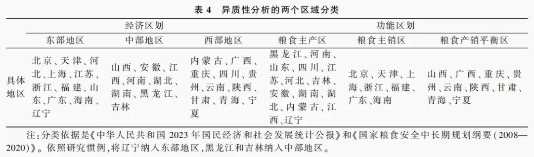 当前我国区域差异、城乡差异、工农差异成为高质量发展面临的重要议题,农民增收问题必然受到地区发展水平、产业结构和农业功能区划的影响。本部分将进行要素综合禀赋与农民增收的区域异质性研究。一是将总样本划分为东部、中部和西部三个区域进行经济分区的异质性分析。二是将总样本划分为粮食主产区、主销区和产销平衡区三个区域进行功能分区的异质性分析。具体分区见表4。