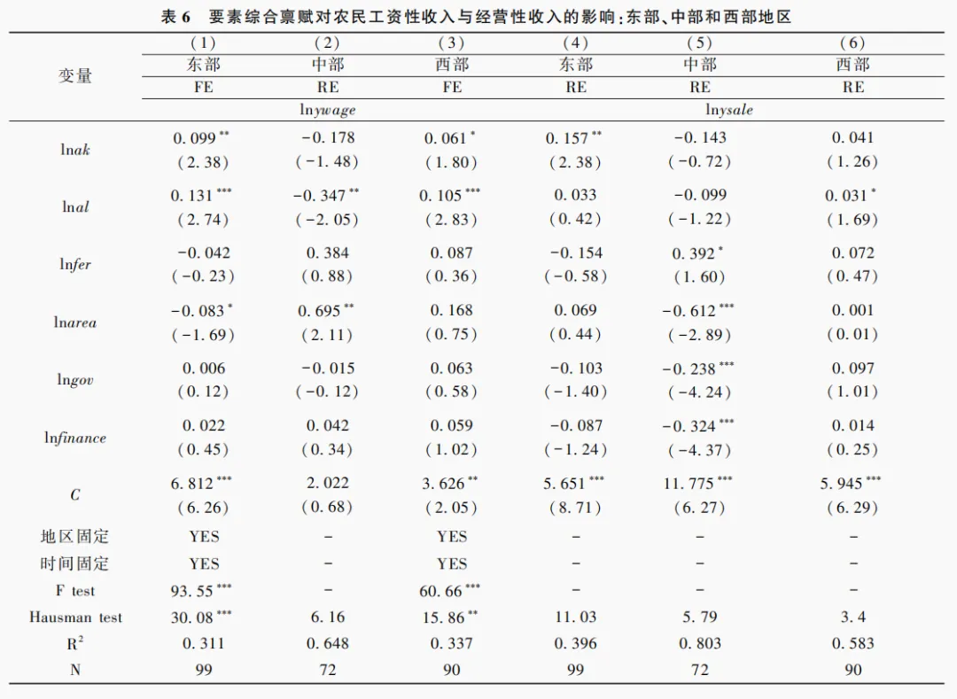表5和表6报告了东部、中部和西部地区要素综合禀赋对农民各收入的回归结果。经过F检验和Hausman检验,分别按照固定效应估计(FE)或随机效应估计(RE)列出适宜的回归结果。由表5可见,无论是东部、中部还是西部地区,劳动综合禀赋与资本综合禀赋提高,均促进农民总收入增加。越是较发达地区,要素综合禀赋的回归系数越大,说明区位优势有利于发挥要素综合禀赋对农民增收的正向效应。由表6可见,东部、西部地区农业的劳动综合禀赋与资本综合禀赋对农民工资性收入和经营性收入依然表现为正向效应,且东部地区作用系数普遍大于西部地区,这与农民总收入的回归结论一致。中部地区要素综合禀赋对农民工资性收入和经营性收入的回归系数由正值变为负值,但多数不显著,说明要素综合禀赋对中部地区农民工资性收入和经营性收入的作用关系不明确。