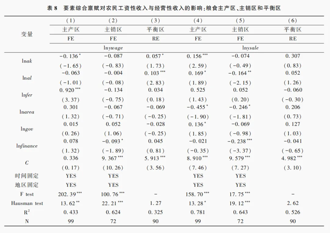 表7和表8报告了粮食主产区、粮食主销区和粮食产销平衡区要素综合禀赋对农民各项收入的回归结果。经过F检验和Hausman检验,分别按照固定效应估计(FE)或随机效应估计(RE)直接列出适宜的回归结果。由表7可见,无论是粮食主产区、主销区和平衡区,除了部分结果变得不显著外,劳动综合禀赋与资本综合禀赋提高,均促进农民总收入增加。由表8可见,在粮食主产区,要素综合禀赋的提高,不利于农民工资性收入增加,但有利于农民经营性收入增加。在粮食主销区,要素综合禀赋对农民工资性收入和经营性收入的作用为负,但不显著。在粮食平衡区,要素综合禀赋对农民工资性收入和经营性收入的作用表现为正向效应,但部分不显著。总体来看,要素综合禀赋能够增加粮食主产区的农民经营性收入,也可以增加粮食平衡区的农民工资性收入。在有偏技术进步作用下,要素综合禀赋对不同类型地区、不同性质农民收入的作用方向和效果不同,也为政府支农、助农提供了新的思路。