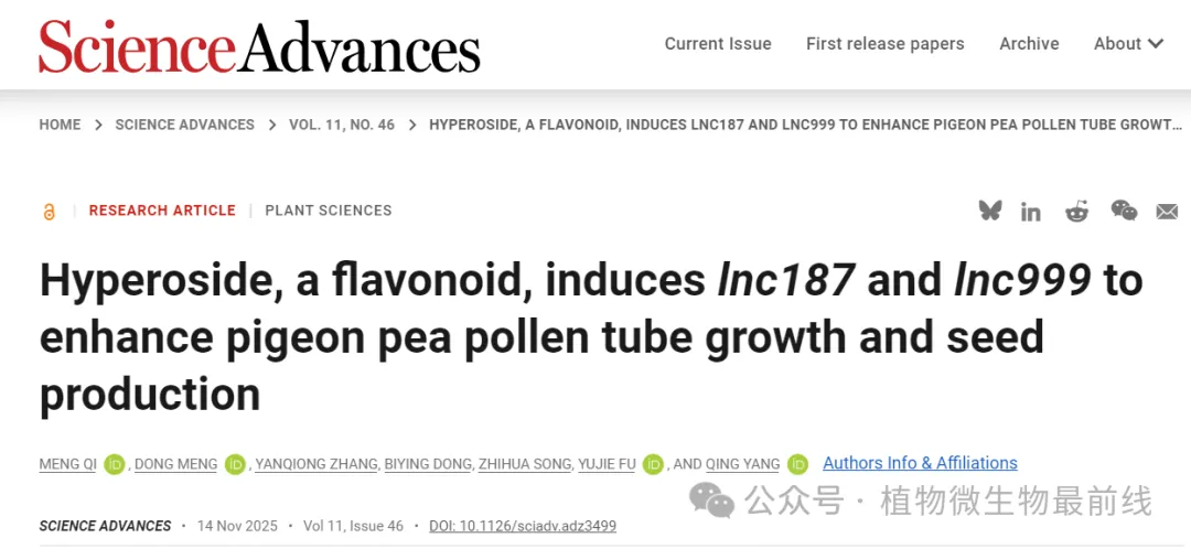 近日,北京林业大学生物学院院长、林学院森林学科负责人付玉杰教授团队在Science子刊Science Advances杂志发表了题为 “Hyperoside, a flavonoid, induces lnc187 and lnc999 to enhance pigeon pea pollen tube growth and seed production” 的研究论文,深入探究了黄酮类化合物金丝桃苷(Hyperoside)在木豆花粉管生长和结实率的关键作用,揭示了长链非编码RNA(LncRNA)通过磷酸化与去磷酸化对发育相关靶基因的网络调控机制,为木豆等重要木本植物的生殖发育研究提供了新的见解和潜在的应用方向。
