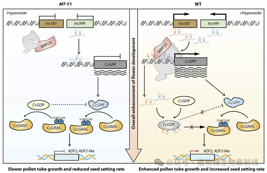 木豆(Cajanus cajan L.)作为一种全球广泛栽培的木本多年生主粮作物,为人类提供了大量的热量和营养,在亚热带地区尤其具有重要的经济意义。然而,木豆的花粉管发育不良导致种子结实率低,影响产量。团队此前的研究发现黄酮类化合物在花发育中扮演重要角色,但其在木豆中的具体作用尚不清楚。本研究中,研究团队发现黄酮类化合物金丝桃苷能够同时通过诱导两个lncRNA(lnc187和lnc999)的高表达,增加木豆的种子结实率。这两个lncRNA不仅受到金丝桃苷的调控,且协同作用调节靶基因的转录和翻译。其中,lnc187是调控网络里的关键效应因子,其缺失可能会直接抑制下游功能。这些lncRNA通过与CcGPP激酶的启动子结合并作为支架招募RNA聚合酶等促进激酶的转录,上调CcGPP的表达,同时抑制CcGDP磷酸酶的蛋白活性,促进花粉管生长和种子结实。该研究阐明了黄酮类化合物金丝桃苷触发的调控轴,即lnc187/lnc999通过激酶/磷酸酶平衡调控CcGRAS的修饰水平进而调节木豆的花粉管生长和种子结实,为高价值木本植物的生殖发育研究提供了独特见解。