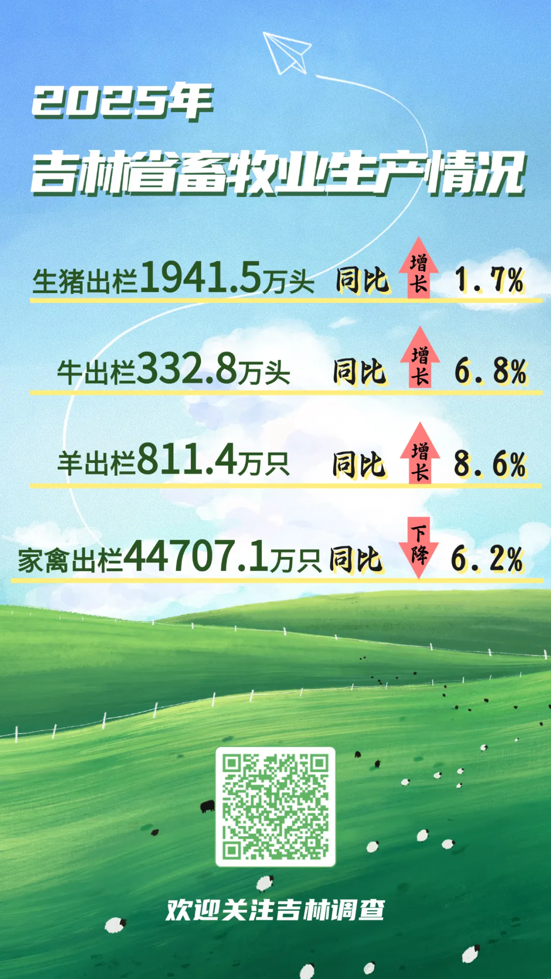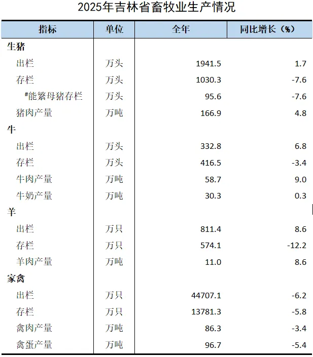 2025年,全省生猪出栏1941.5万头,同比增长1.7%;猪肉产量166.9万吨,同比增长4.8%。四季度末,全省生猪存栏1030.3万头,同比下降7.6%。其中,能繁母猪存栏95.6万头,同比下降7.6%。2025年,全省牛出栏332.8万头,同比增长6.8%;牛肉产量58.7万吨,同比增长9.0%;牛奶产量30.3万吨,同比增长0.3%。四季度末,全省牛存栏416.5万头,同比下降3.4%。
