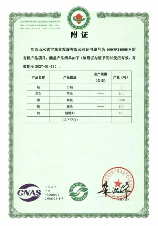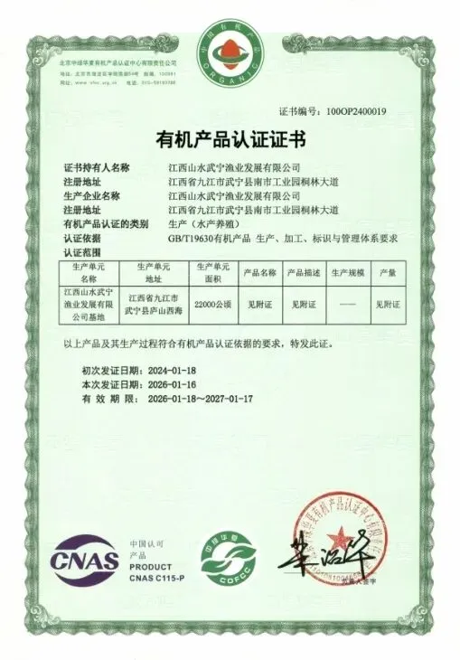 近日,武宁渔业公司养殖的鳙鱼、白鲢等系列水产品,通过了中绿华夏有机产品认证。这是武宁渔业鳙鱼连续第九年通过有机产品认证,彰显了公司对产品品质的高度重视与不懈追求。