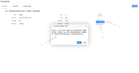 3.照片上传要求:需上传近期免冠二寸白底证件照(分辨率为413×626像素,文件大小不超过1024KB,格式为JPG),照片用于毕业生档案,请勿上传生活照或不符合要求的图片。