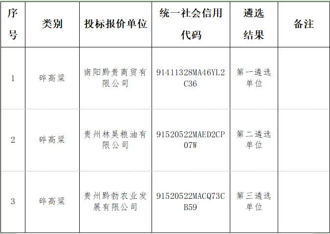 黔西市农业投资开发有限公司碎高粱出售竞争性谈判结果公示